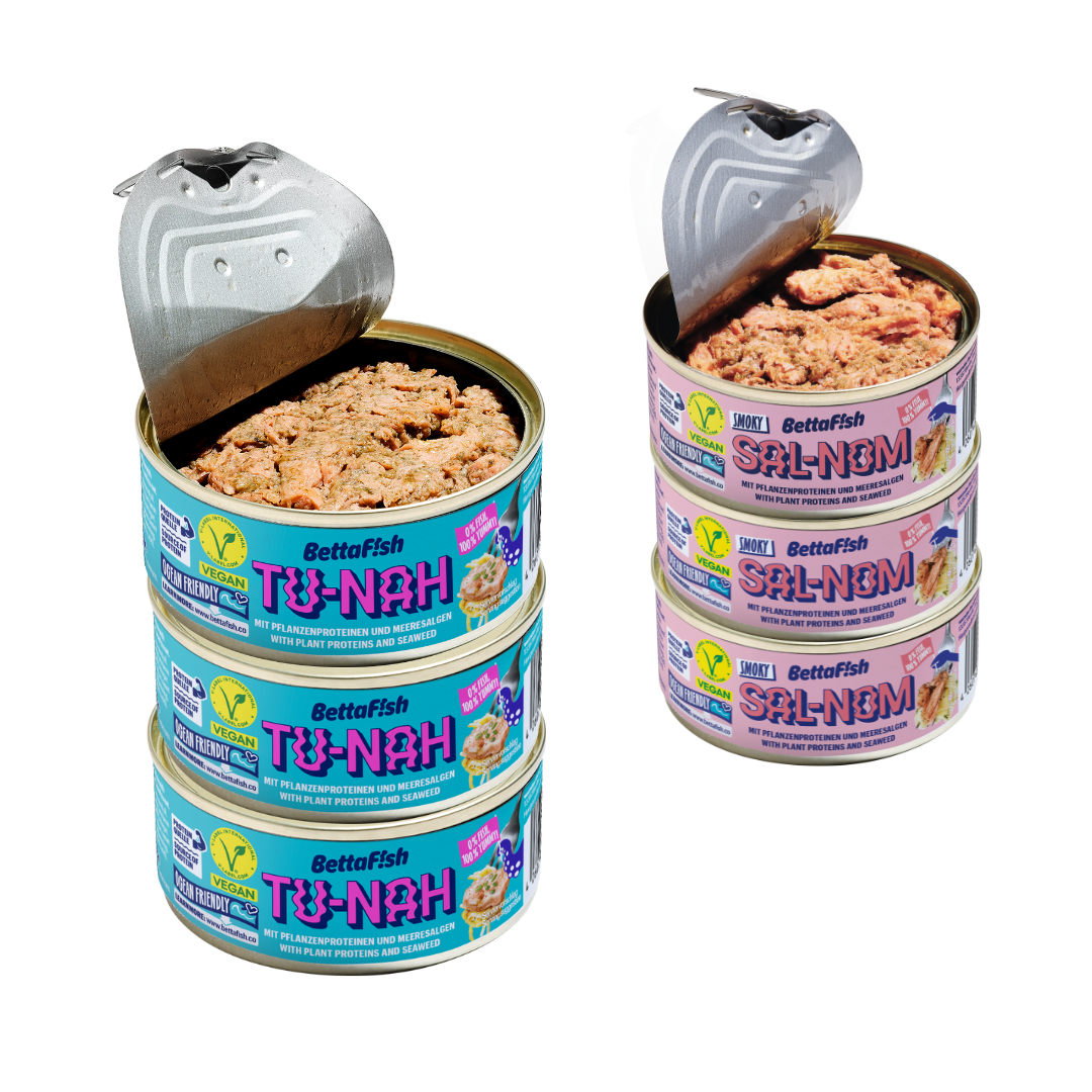 Bei BettaF!sh stehen unsere Meere an erster Stelle – und mit ihnen großartiger Geschmack. Deshalb stehen TU-NAH und SAL-NOM dem fischigen Original in nichts nach. Und was ist dann anders? Wir bereiten ihn aus Meeresalgen und Ackerbohnen zu – 100% pflanzlich und voller Protein. So kannst du mit gutem Gewissen alte Lieblinge schlemmen. Probier’ es selbst und schwimm mit uns gegen den Strom.